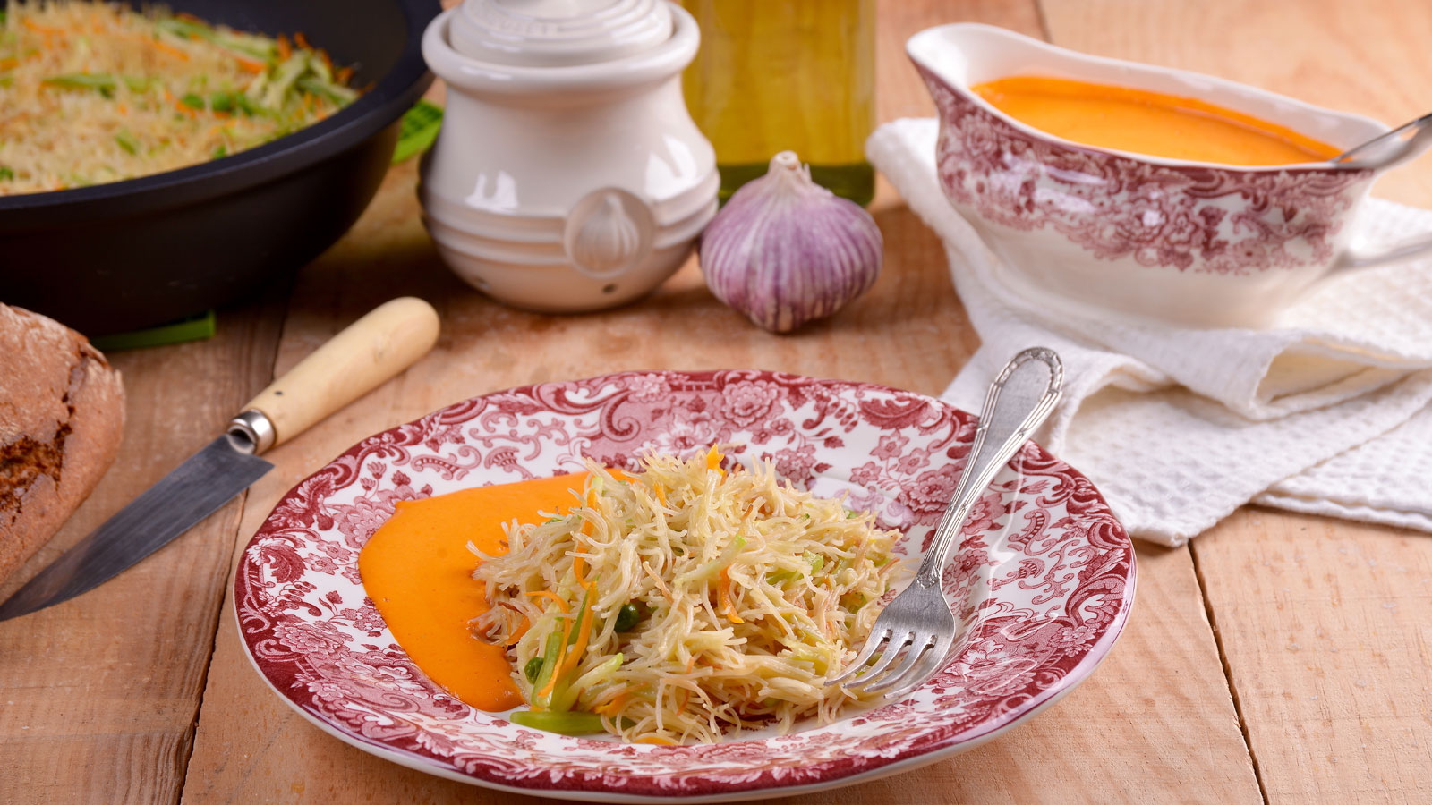 Fideuá vegetal con salsa de piquillo
