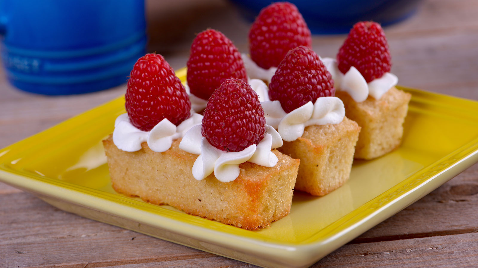 Cuando los financiers estén fríos, decoramos su superficie con nata montada y un par de frambuesas frescas. Listos para servir.