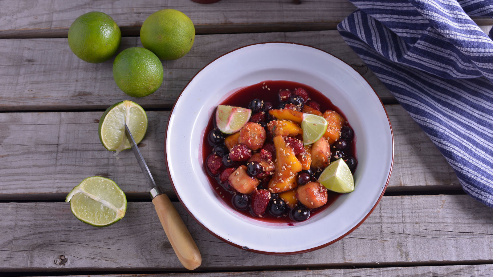Sacamos del fuego la fruta y la emplatamos. Coronamos con la menta picada y el sésamo.