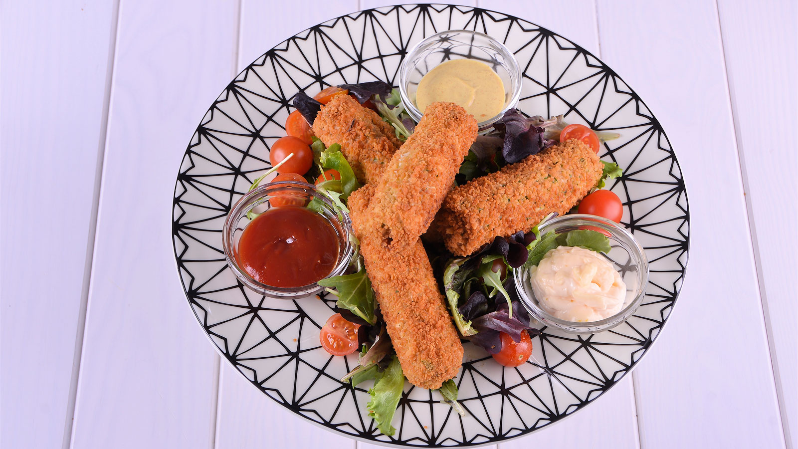 Emplatamos los flamenquines sobre hojas verdes aderezadas con la vinagreta, tomates cherry y dips de salsas para mojar.
