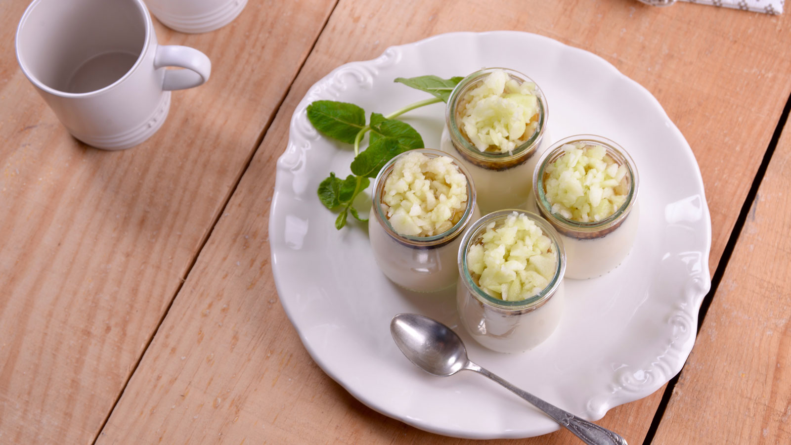 Cubrimos con un poco de caramelo líquido el flan de los tarros de cristal. Terminamos con el granizado de manzana.