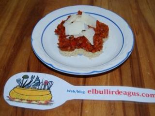 •Con la ayuda de un aro de presentación en forma de flor, se pone una capa de mijo, aplanándola con una cuchara, y encima se pone una capa de la mezcla de carne y verduras caliente, se alisa con una cuchara, se retira con cuidado el aro de presentación y se remata con unas lascas de queso parmesano.