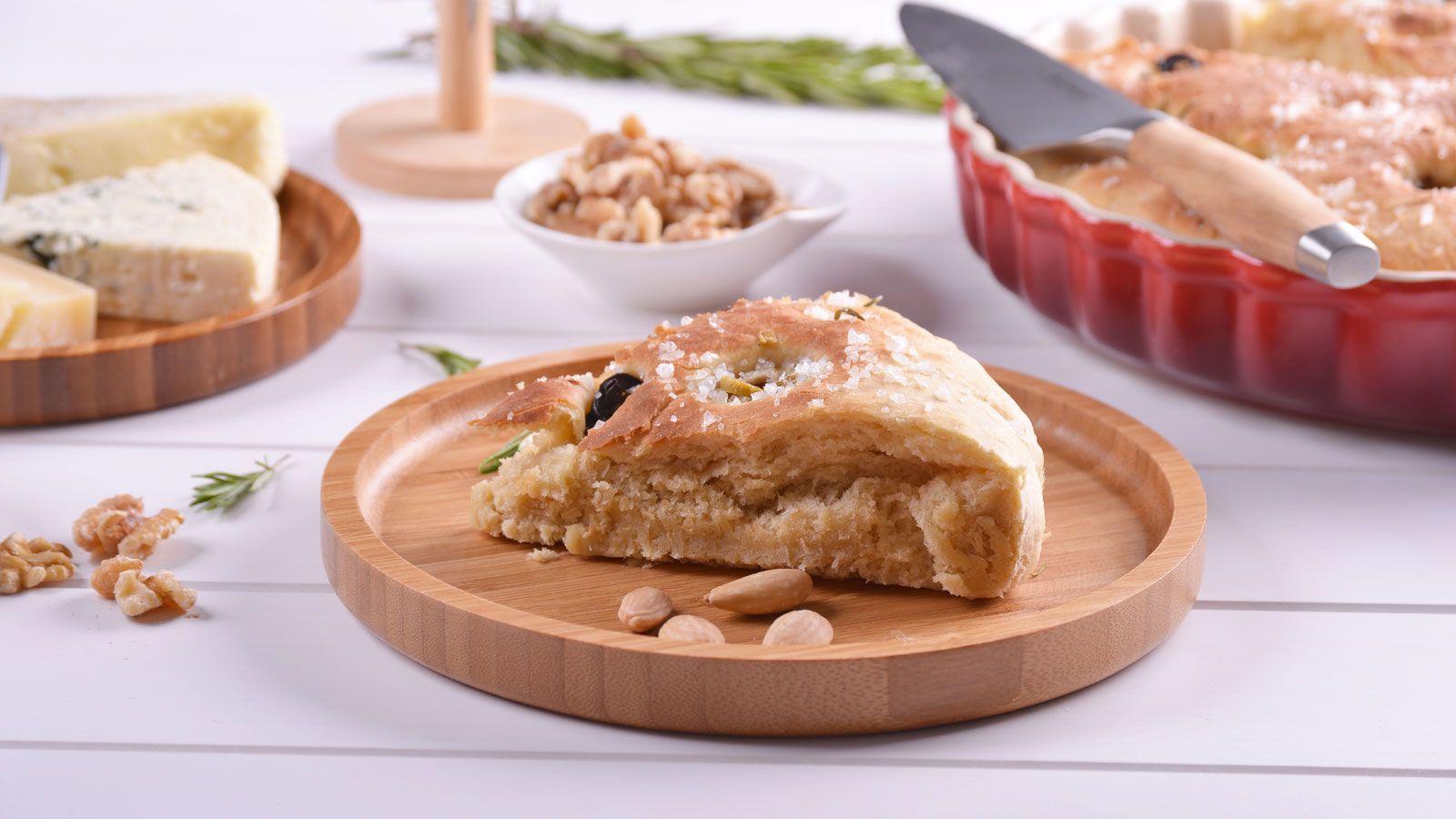 Pan focaccia de olivas y romero y tabla de quesos