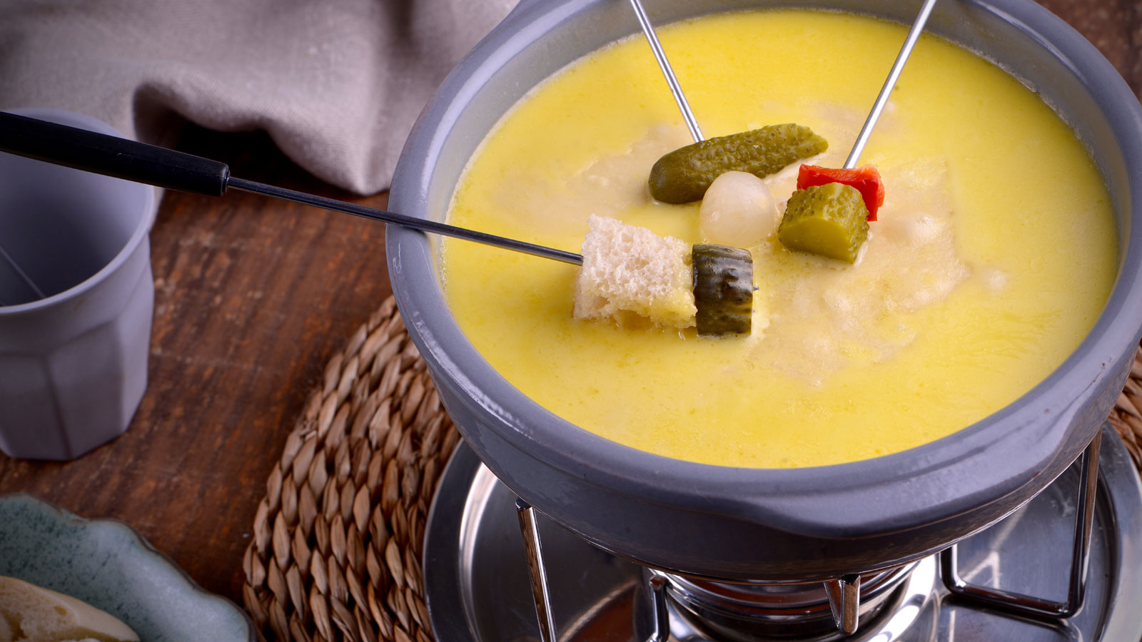 Servimos la fondue y acompañamos con un plato con los encurtidos y el pan cortado en dados grandes.