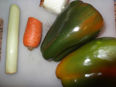 Troceamos todas los ingredientes en juliana y reservamos dos tiras de los pimientos verdes.