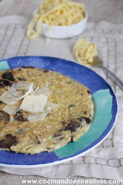 Batimos los huevos, añadimos la pasta y las setas. Incorporamos sal, pimienta negra recién molida y queso parmesano que rallamos, con generosidad.