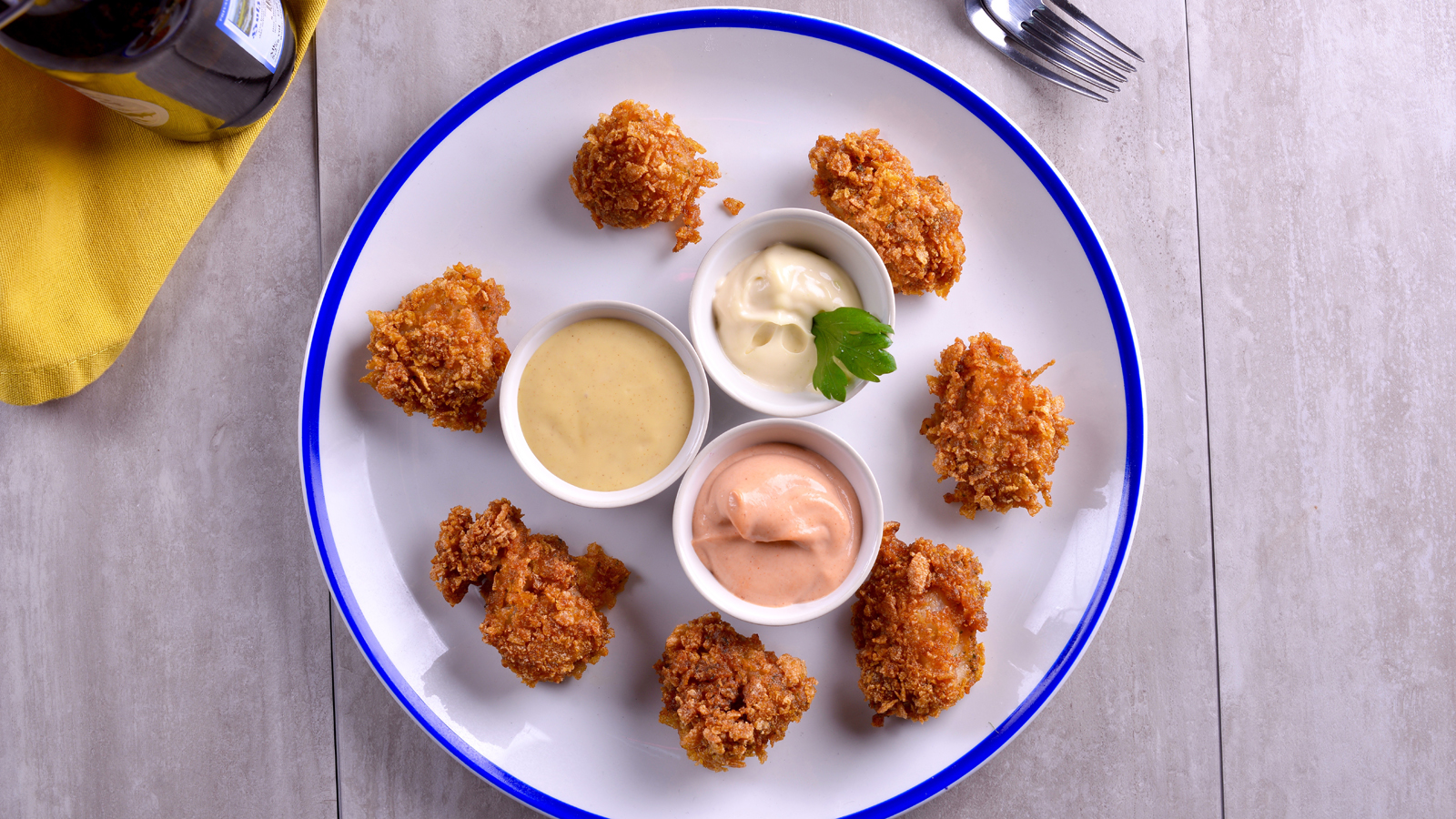 Fritos de rape al estilo KFC con trío de mahonesas