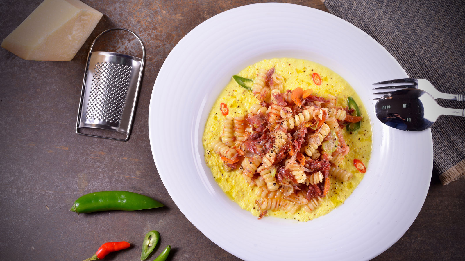 Para el emplatado vertemos la crema de pimientos, añadimos los fusilli con el ragú de pato por encima. Coronamos con unas rodajas de chile rojo y verde. Con ayuda de un rallador, rallamos un poco de queso grana padano por encima.