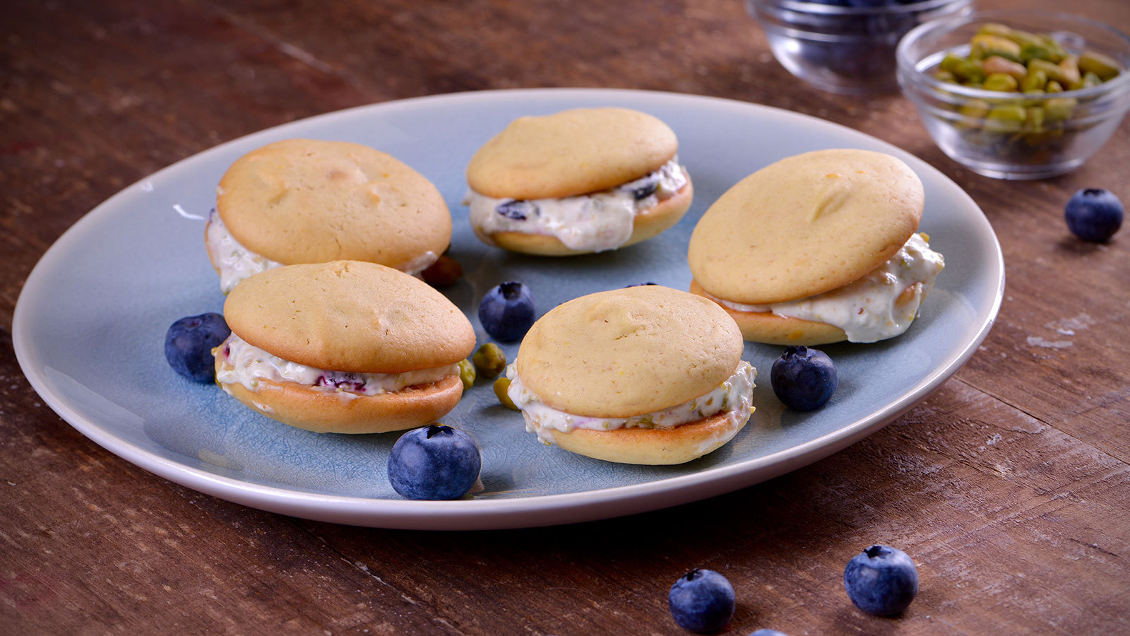 Galletas abizcochadas con helado de yogur, arándanos y pistachos