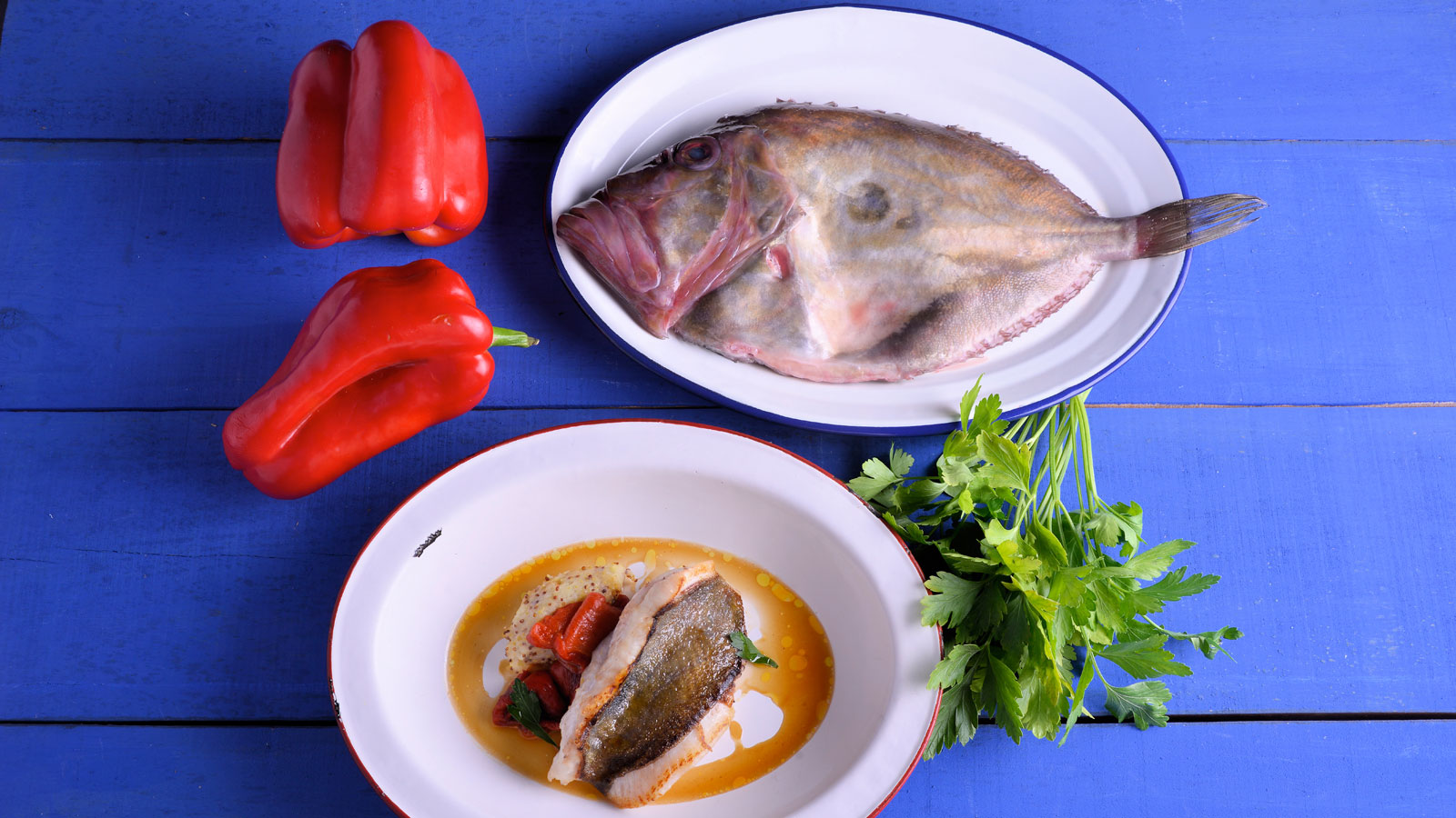 Gallo San Pedro con pimiento asado y patata a la mostaza