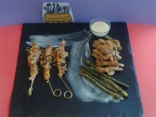 •Se presentan 3 gambones por persona, unas verduras en tempura, unos espárragos y la salsa de cítricos que acompañaremos con un pequeño bol individual con más salsa de cítricos, para poder untar las verduras. Delicioso.