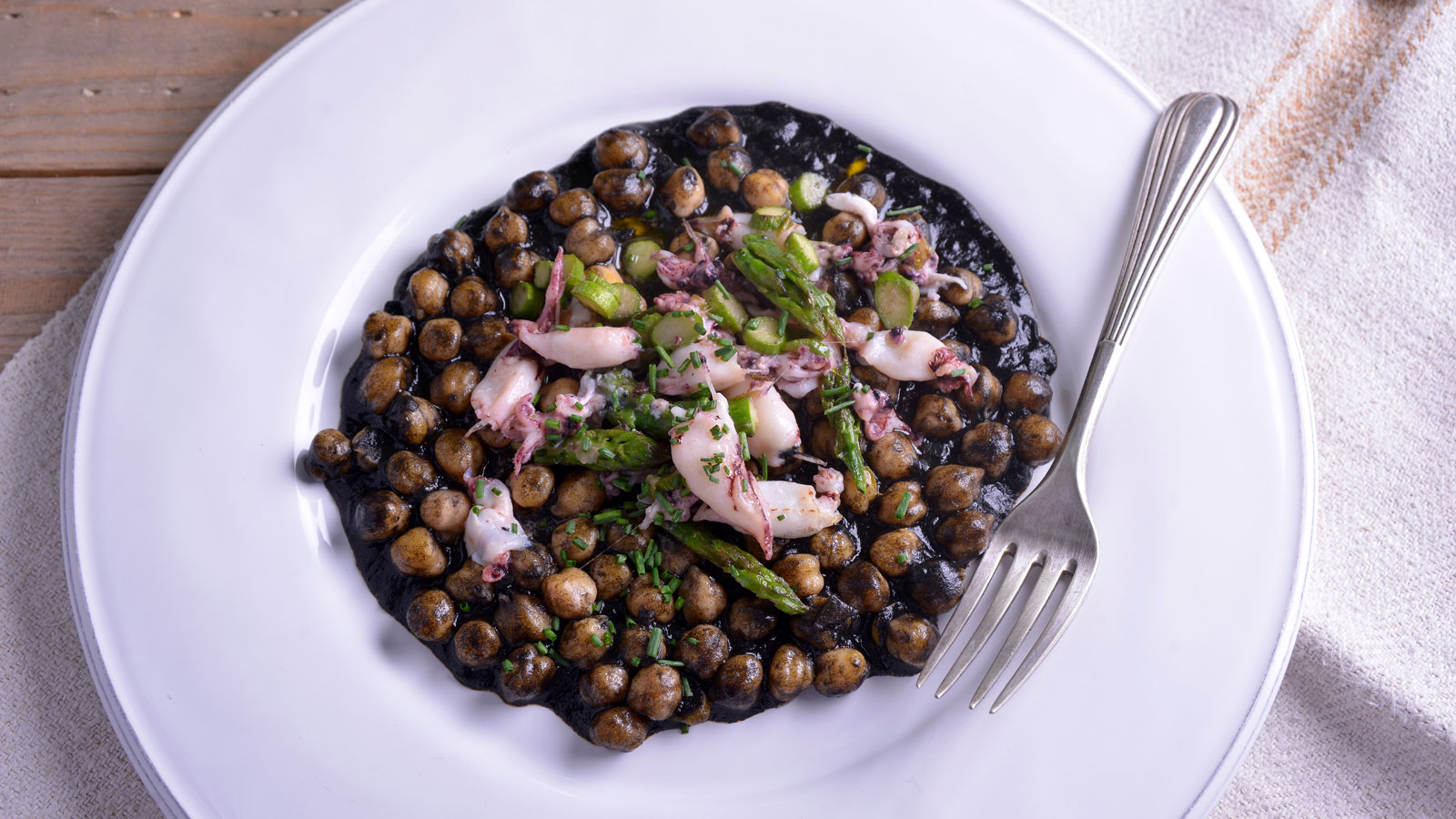 Emplatamos poniendo en la base la salsa de garbanzos y encima los chopitos y los espárragos. Terminamos con cebollino picado.