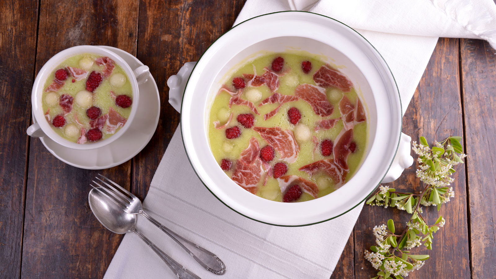 Servimos el gazpacho de melón en cuencos individuales acompañado de frambuesas, las bolas de melón y 250 g de jamón ibérico en lonchas