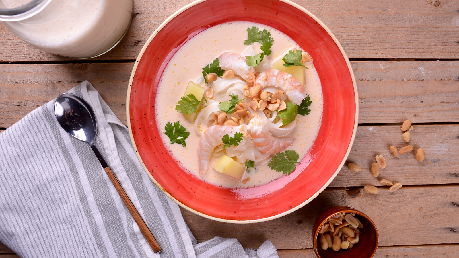Gazpachuelo tailandés con fideos de arroz y cacahuetes tostados