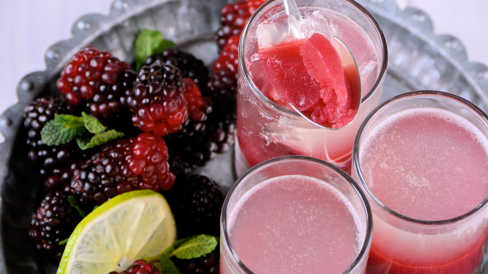 A continuación, disponemos unos vasos pequeños sobre una bandeja y los llenamos hasta la mitad con la gelatina de moras. Reservamos 15 minutos en la nevera para que gelifique.