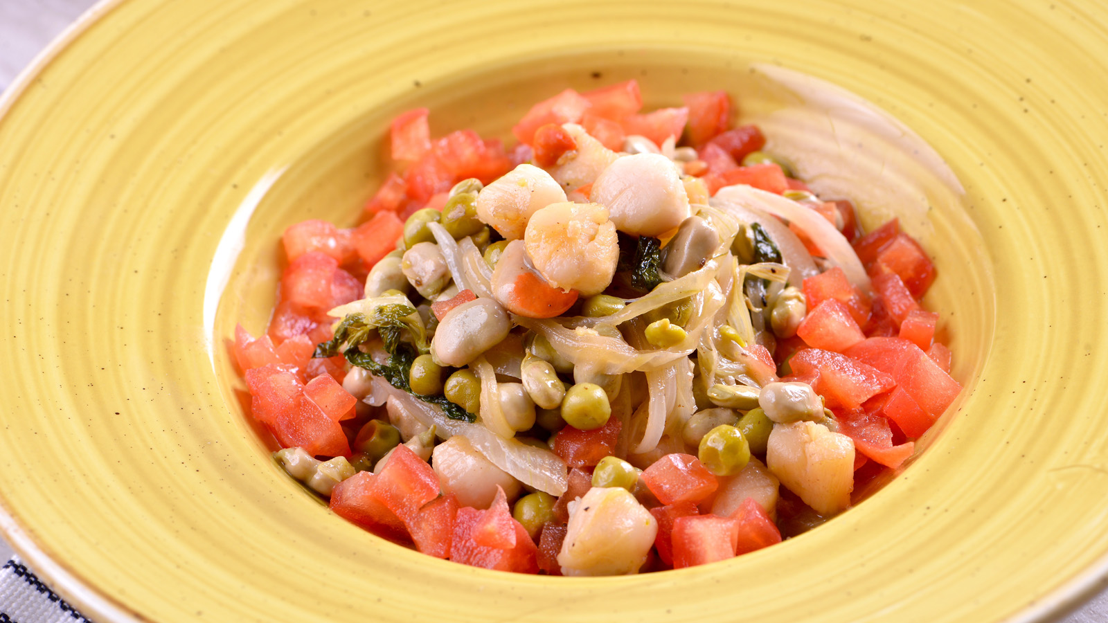 Dejamos que reduzca y servimos inmediatamente con las zamburiñas reservadas y tomate en rodajas.
