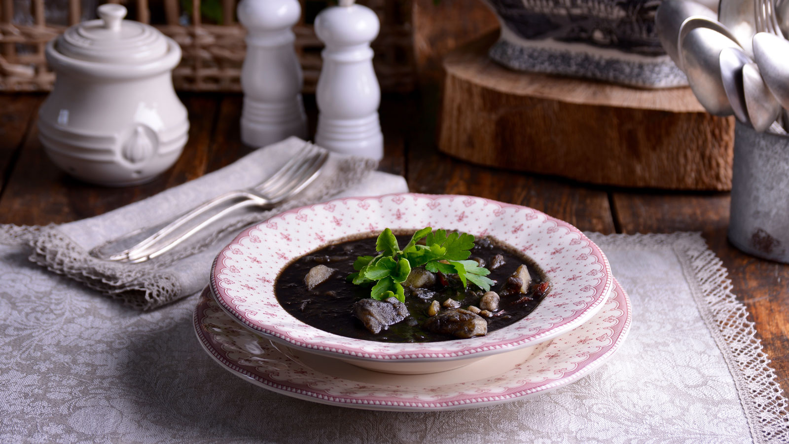 En un mortero machamos un poco la bolsa de tinta de choco y perejil picado. Disolvemos esta mezcla con ½ vaso de vino blanco y vertemos todo a la cazuela.