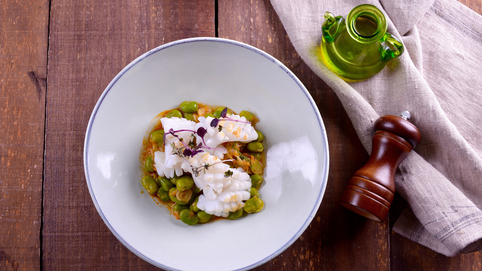 Servimos las habas, el choco y terminamos con unos brotes y un poco de aceite de oliva virgen extra.