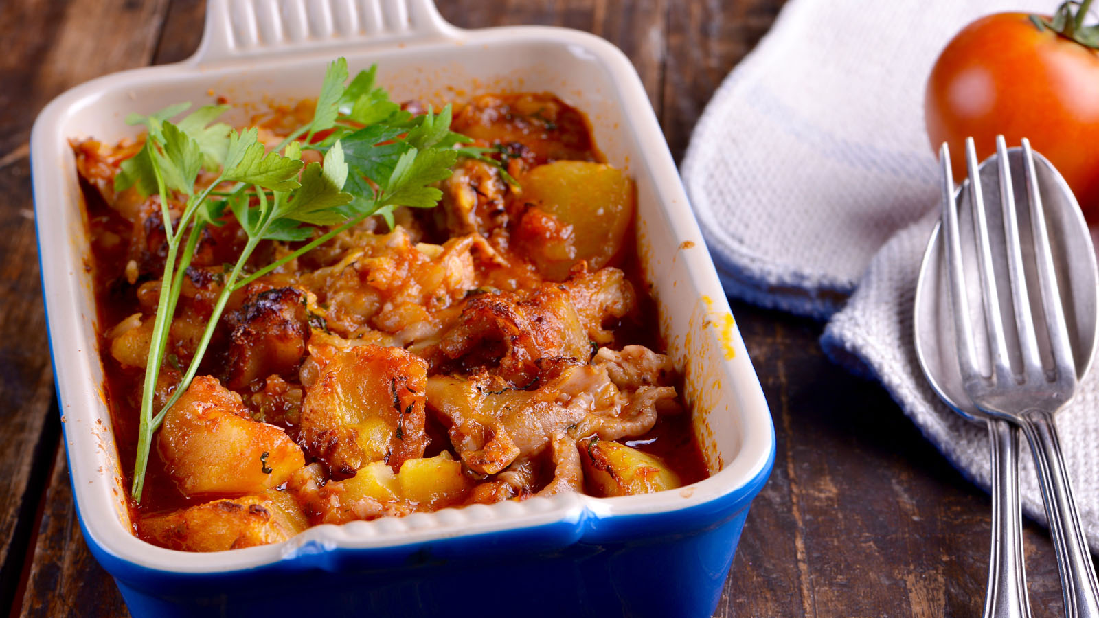 Vertemos el guiso en una fuente apta para horno y horneamos todo durante 20 minutos a 180ºC.
