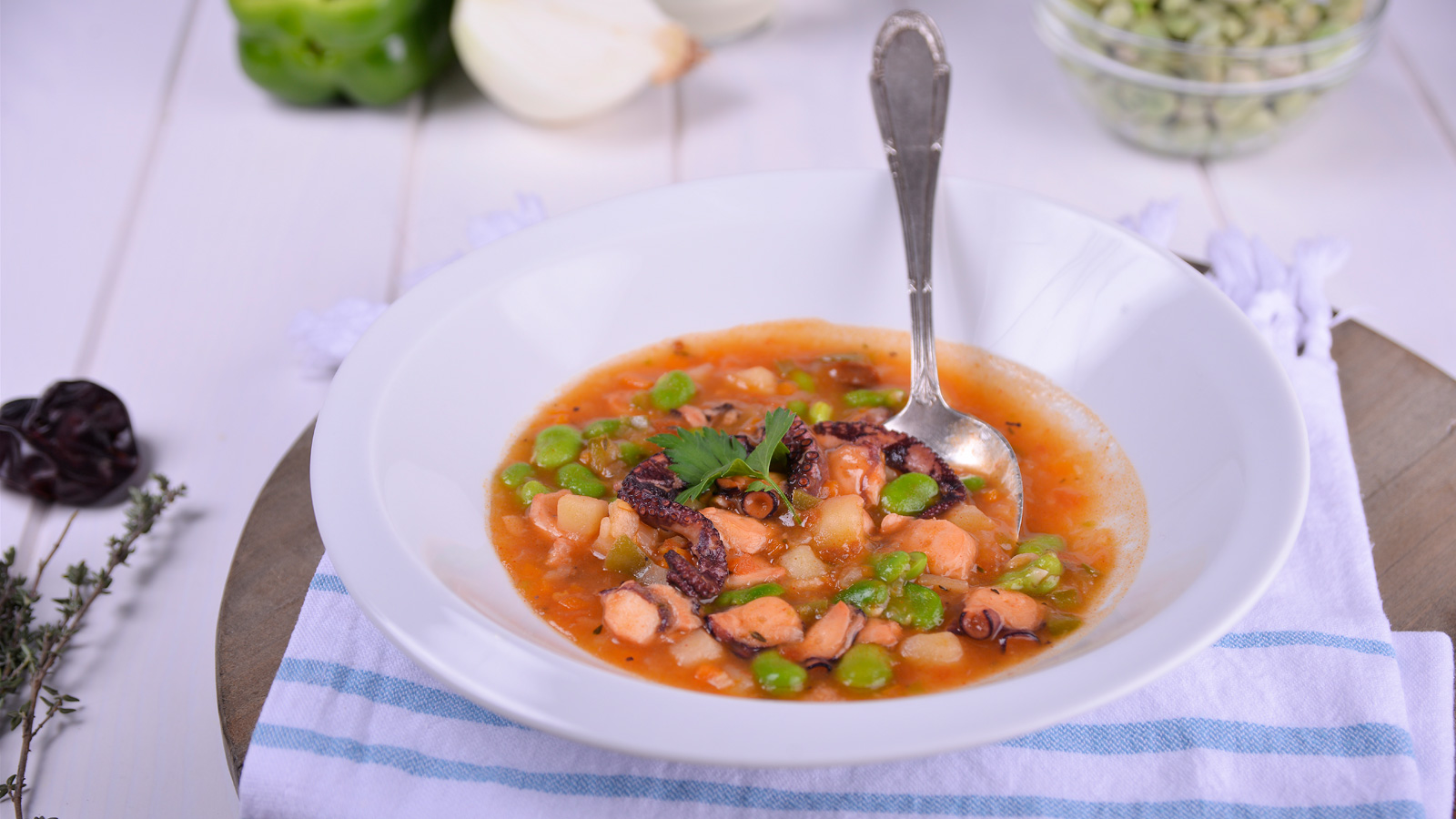 Entonces, incorporamos a la olla el fumet, la ñora, la guindilla, las patatas cortadas en cuadritos, el laurel, el tomillo y las rodajas de pulpo. Cocinamos durante 20 minutos o hasta que las patatas estén hechas.