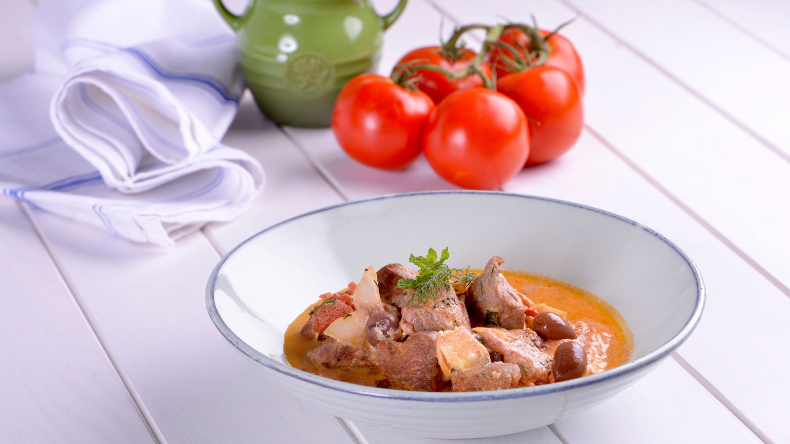 En el capítulo 604 del programa de televisión Los 22 minutos de Julius T5, Julius - Julio Bienert prepara la receta de Guiso griego de cerdo.