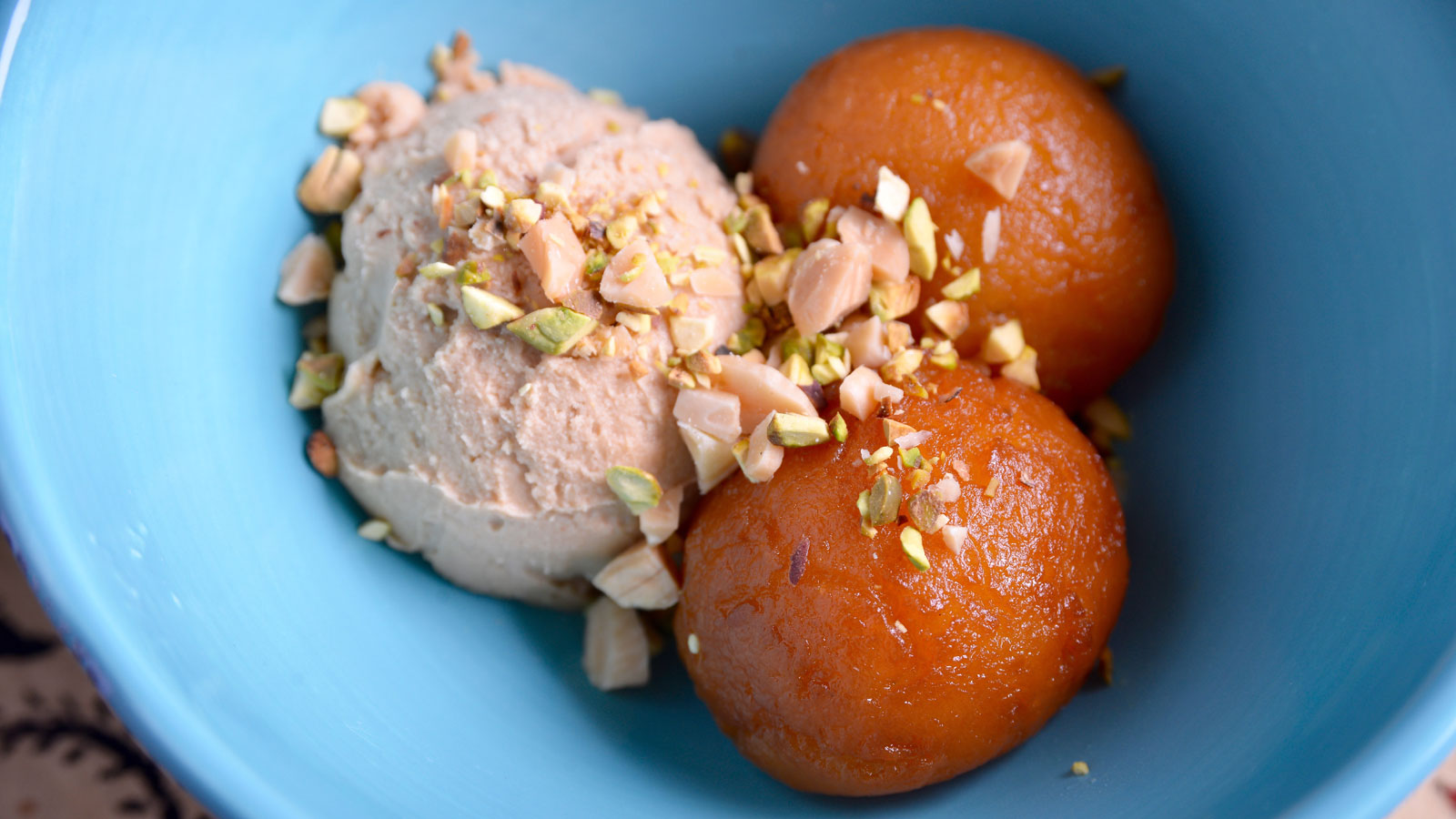 Acompañamos los gulab jamun con una bola de helado de vainilla y los frutos secos picados.