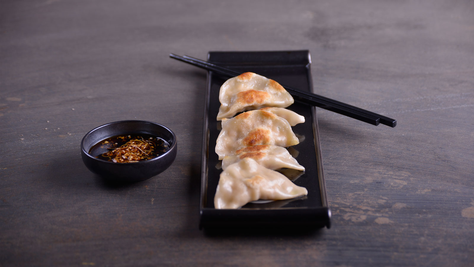Servimos en un plato rectangular, distribuimos las gyozas de lado y acompañamos con la salsa de ajo y jengibre.