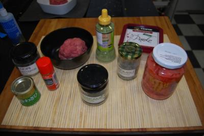 •Se mezcla la carne de vacuno y se mezclan con las algas en polvo, una cucharadita de wasabi en polvo, las semillas de sésamo al wasabi, la miga de pan (Panko),