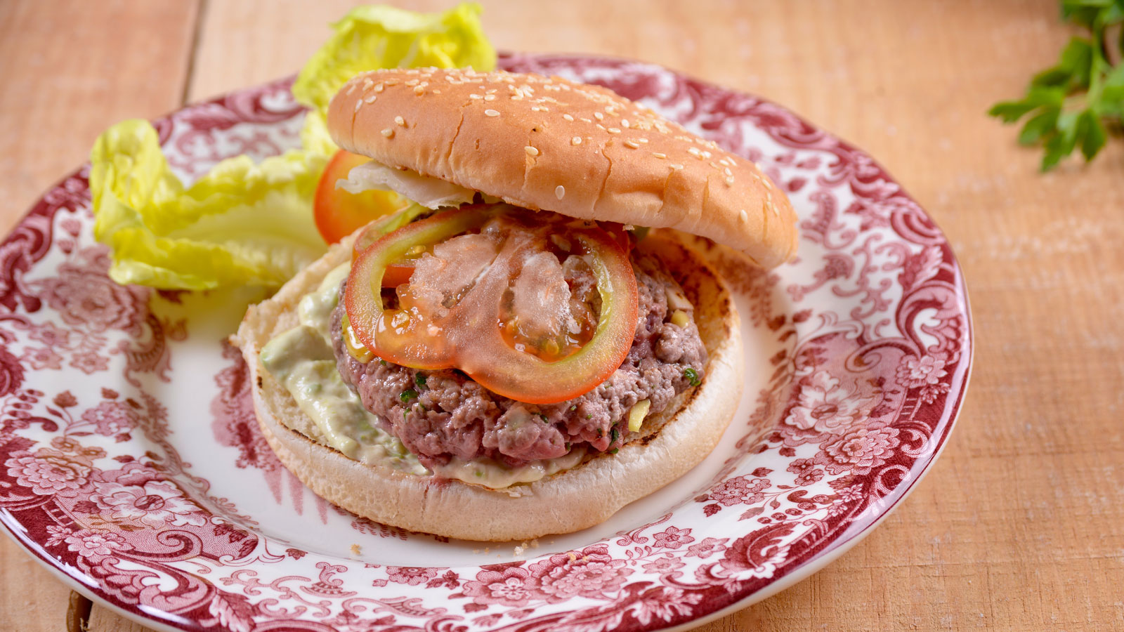 En un plato amplio, colocamos 1 mollete de pan de hamburguesa con sésamo, untamos la base con la salsa de aguacate, ponemos una hamburguesa, 1 cucharada de cebolla frita y coronamos con una rodaja de tomate y unas cuantas hojas de lechuga. Cerramos con otro mollete y servimos.