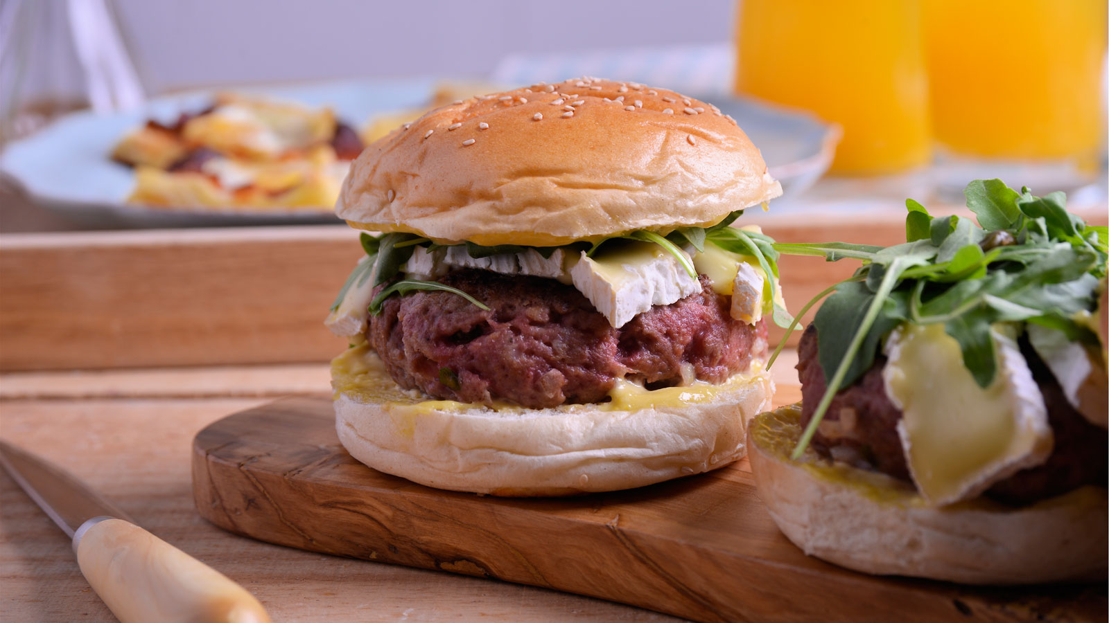 Cubrimos las hamburguesas con dos lonchas de queso camembert aprovechando el calor de la carne para que se derrita el queso.
