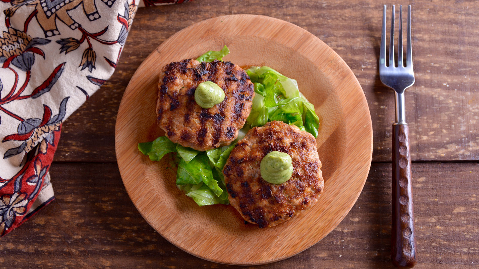 Retiramos de la sartén y emplatamos cubriendo el fondo del plato con la salsa de aguacate, una cama de lechuga y encima las hamburguesas.