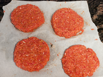 Dividimos la carne en cuatro porciones iguales. Lo mejor es hacer una bola con la mano e ir aplastándola con la mano, dándole la forma que deseamos. Como ya tenemos los panecillos horneados medimos el tamaño perfecto que tienen que tener. Es mejor hacerlas un poco más grandes, ya que cuando las friamos disminuirán de tamaño.