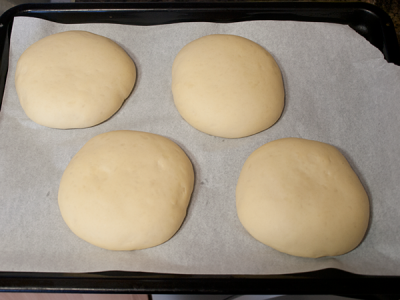 Pasado el tiempo, deshinchamos la masa y la dividimos en cuatro. Yo he hecho hamburguesas muy grandes, para servirlas como plato único. Podemos pesar cada porción para hacer los panes iguales. Les damos forma redondeada con la mano y los colocamos sobre una bandeja de horno cubierta con papel de horno. Los cubrimos con un trapo húmedo y los dejamos que se hinchen durante una hora, hasta que dupliquen su tamaño.