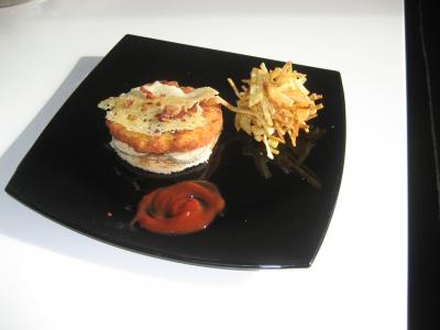 Montar la hamburguesa poniendo el pan tostado en primer lugar al que habremos untado una capa de mostazo al estragón, después unas rodajas de calabacín, después la hamburguesa y por último una lamina de crujiente de queso. Acompañar con las patatas y un poco de ketchup.