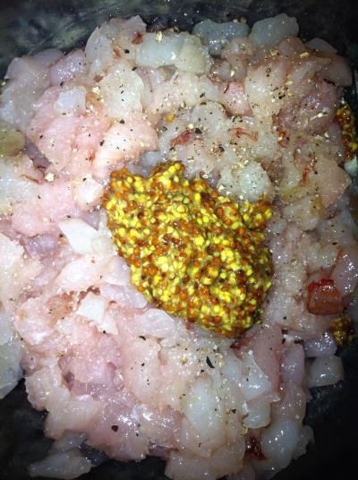 Lo primero que vamos a realizar es la carne de la hamburguesa para que le de tiempo a marinarse con la mostaza. Cogemos la pechuga de pollo y la picamos con el cuchillo a cuadraditos pequeños. Disponemos la carne en un bol y picamos los gambones del mismo tamaño que el pollo. Le echamos la sal, la pimienta, una cucharada de mostaza a l´Ancienne Maille, la miga de pan, una cebolleta fresca picada finamente y una yema de huevo. Se revuelve bien y se reserva en el frigorífico.