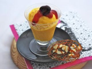 Helado de Camembert con salsa de guindas y crujiente de almendras