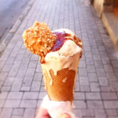 Emplatar dos bolas de helado, junto a una teja almendrada. Decorar el plato con la mermelada y las flores naturales.