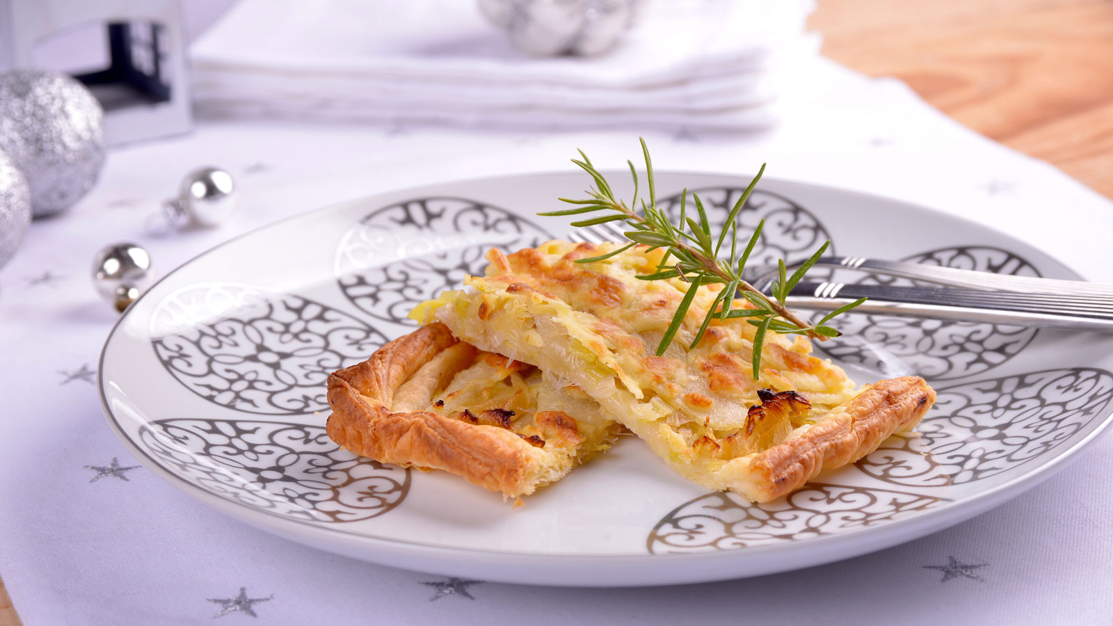Hojaldre de puerro, pera y parmesano