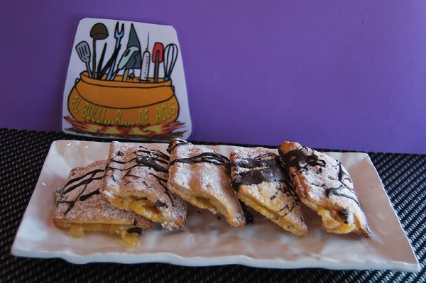 •Se aparta del fuego, se deja templar, se echa un poco de crema encima de la mitad de los rectángulos de placa de hojaldre y con la otra mitad se tapan y se cierran y se pintan con huevo las uniones.