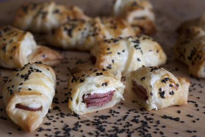 Colocamos tres rodajas de lukanka en la parte más ancha del triángulo, ponemos encima un poco de queso y enrollamos sobre el hojaldre hacia el pico. Cuando estén todos listos, los ponemos en una bandeja de horno cubierta con papel vegetal. Pintamos cada uno con el huevo batido y espolvoreamos el sésamo negro por encima.
