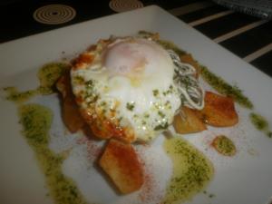 Montar el plato poniendo las patatas, encima de éstas el sucedáneo de angulas y por último el huevo frito, sazonarlo con sal maldon, espolvorear el pimentón de la vera y decorar con el aceite de perejil y ajo.