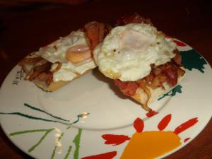 Primero cogemos el pan y lo abrimos por la mitad , luego lo introducimos en el horno para que se tueste un poco, luego cogemos la cebolla y la cortamos en juliana, no tan pequeña y la echamos a la sartén. Cuando la cebolla lleve un rato al fuego le echaremos una pizca de azucar para darle un poco de sabor dulce, sacamos el pan del horno y con el mismo calor del horno , meteremos las dos lonchas de jamón liada en papel de horno. Lo dejamos unos 5 minutos y lo sacamos, el jamón estará crujiente. Colocaremos el jamón en el pan, dos lonchas en cada rebanada, cuando la cebolla esté doradita, se lo echaremos también al pan en cada esquina, y pondremos en la sarten los huevos para freirlos, cuando este hecho el huevo lo pondremos en medio del pan quedando el huevo en el centro. ponerlo en un plato grande y listo para comer.