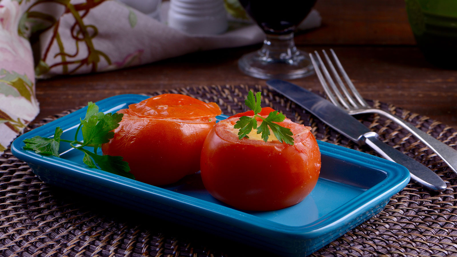 Pasado este tiempo, retiramos la bandeja del horno y servimos los tomates muy calientes con perejil fresco de adorno.