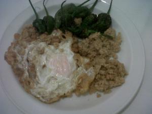 desmigamos un poco de pan de millo en un plato, freímos los pimientos de padrón en una sartén con bastante aceite de oliva no muy fuerte; retiramos los pimientos a un plato con papel de cocina para que los pimientos no tengan exceso de aceite y les echamos sal gorda o sal maldon; en ese mismo aceite freimos dos huevos por persona, mejor si son huevos de "casa" una vez fritos los echamos encima de la cama de pan de millo y los rompemos, los servimos acompañados de los pimientos de Padrón y una copa de vino.