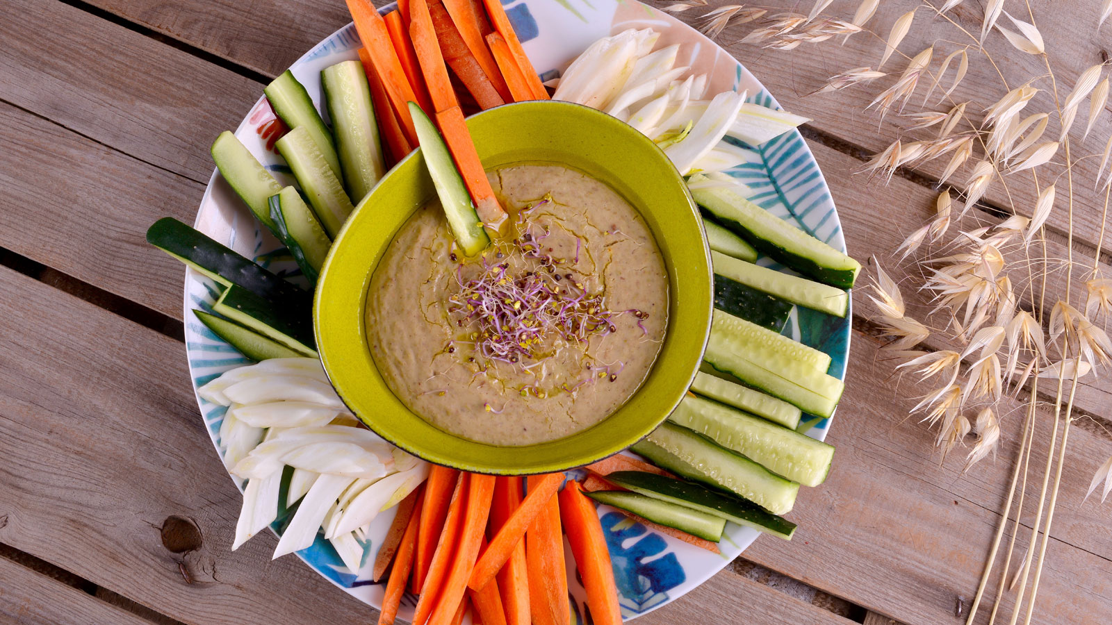 Hacemos bastoncillos con los vegetales y servimos el hummus de soja regándolo con un poco más de aceite y pimienta recién molida.