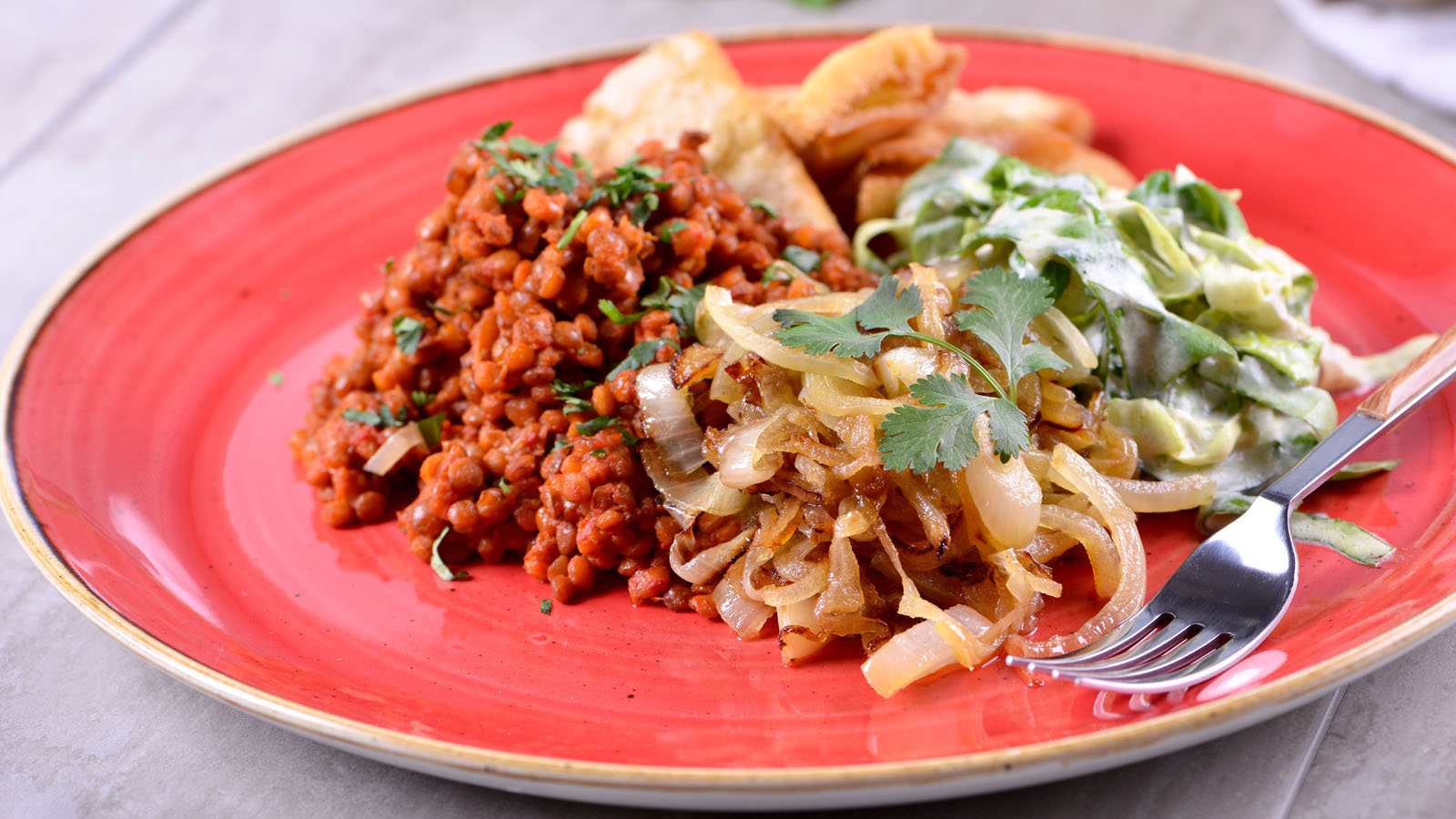 Servimos las lentejas salteadas con cilantro picado por encima, la ensalada, la cebolla pochada y el pan pita frito.