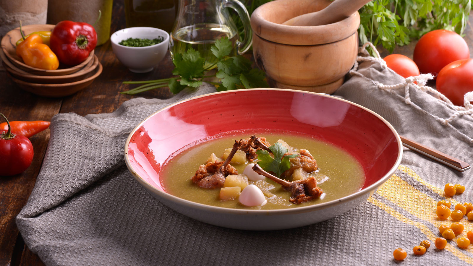 Inchicapi con codorniz (Sopa de pollo con yuca, nabo, huevo y muslos de codorniz)