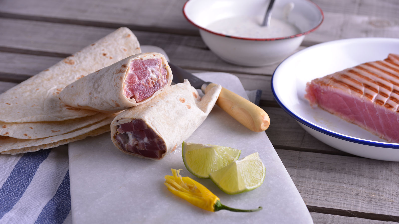Seguidamente, cortamos el atún en lonchas de 0,5 cm de grosor aproximadamente. En la superficie de trabajo, extendemos el pan de kebab. Incluimos las lonchas de atún en el centro del pan, unas rodajitas de chile y salseamos.