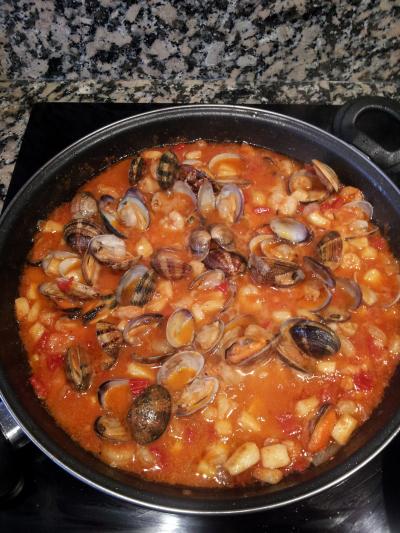 CUANDO LA BASE YA ESTÁ ACABADA INCORPORAMOS LAS AMEJAS,EL VASITO DE VINO BLANCO Y DEJAMOS QUE ABRAN.