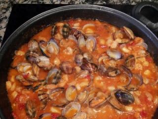 CUANDO LA BASE YA ESTÁ ACABADA INCORPORAMOS LAS AMEJAS,EL VASITO DE VINO BLANCO Y DEJAMOS QUE ABRAN.